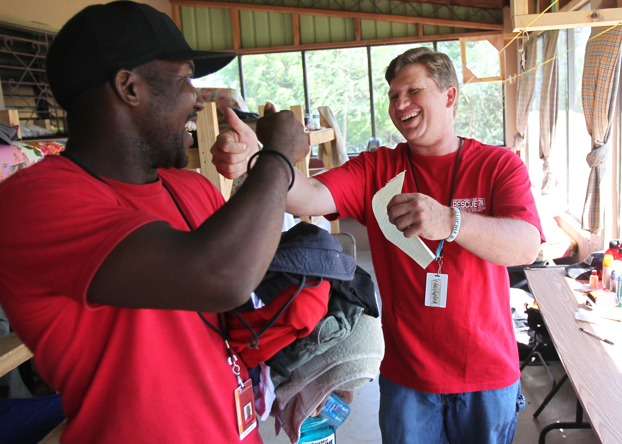 Chris Yarboro of Roxboro, right, says goodbye to Laurent Jones after giving him some clothes during the last working day in Titanyen for this group of the North Carolina Baptist Men Disaster Relief team in Titanyen, Haiti Friday May 7, 2010. ETHAN HYMAN - ehyman@newsobserver.com